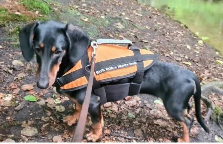 Schwimmhilfe mit guter Passform auf Grund des weichen Schaumes und des Gurtverschlusses, Haltegurt sowie Ring für Hundeleine