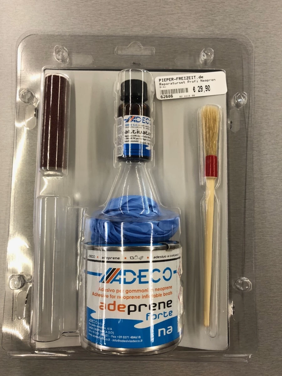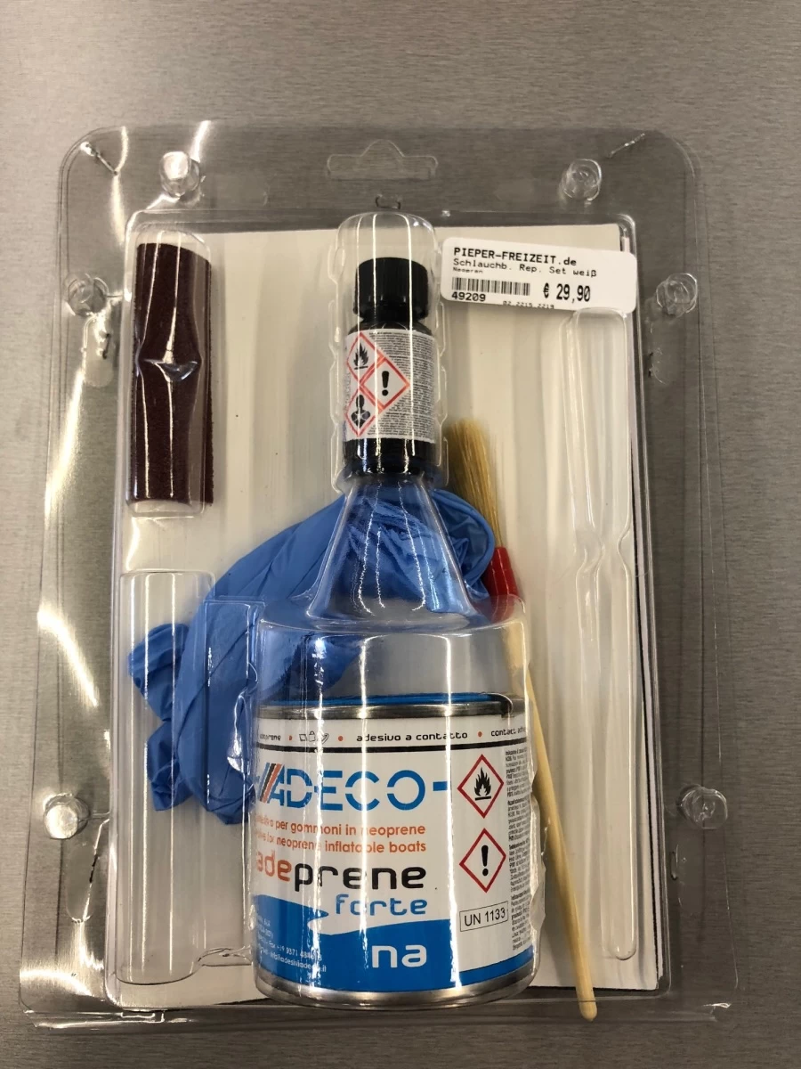 Inhalt: 2 große Flicken 14 x 21 cm, 1 Dose Kleber 125 g, 1 Flasche Härter 10 ml, 1 Pinsel, Schleifpapier